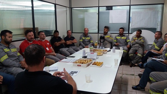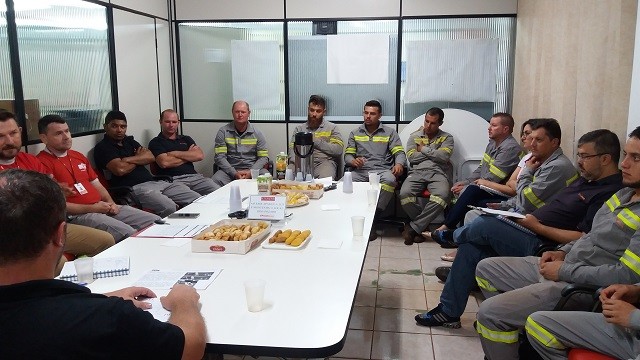 A reunião com café da manhã com os encarregados de equipes, gerentes, diretores e técnico em Segurança do Trabalho acontece todos os meses nas bases de SRO, FWE e TPA. Momento de passar e receber informações sobre segurança, produtividade, qualidade nos serviços, qualidade de vida no trabalho entre outros.
