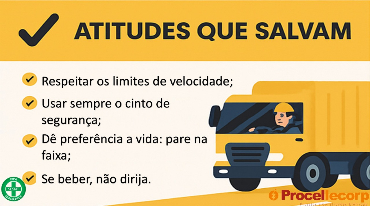 Todos os dias, centenas de colaboradores da Procel pegam a estrada para fazer o que sabem fazer de melhor: entregar energia, compromisso e resultados. Caminhões, carros e máquinas se tornam extensões do nosso trabalho — e, por isso, a segurança no trânsito é assunto sério, inegociável e parte da nossa rotina.
